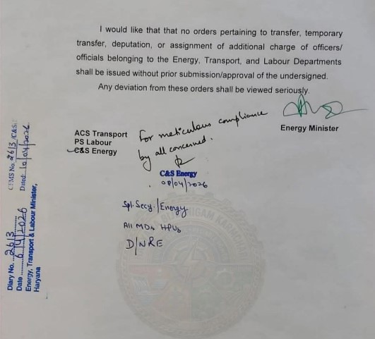 ਹਰਿਆਣਾ, 13 ਅਪ੍ਰੈਲ 2026 : ਹਰਿਆਣਾ (Haryana) ਵਿਚ ਭਾਰਤੀ ਜਨਤਾ ਪਾਰਟੀ ਦੀ ਅਗਵਾਈ ਵਾਲੀ ਸਰਕਾਰ ਦੇ ਕੈਬਨਿਟ ਮੰਤਰੀ (Cabinet Minister) ਅਨਿਲ ਵਿਜ ਵਲੋਂ ਇਕ ਹੁਕਮ ਜਾਰੀ ਕੀਤੇ ਜਾਣ ਦਾ ਸਮਾਚਾਰ ਮਿਲਿਆ ਹੈ ।