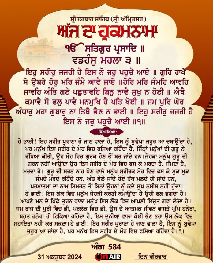NewsPunjabSikhism ਅੱਜ ਦਾ ਹੁਕਮਨਾਮਾ By On Air 13 - October 31, 2024 0 85 FacebookTwitterPinterestWhatsApp ਅੱਜ ਦਾ ਹੁਕਮਨਾਮਾ