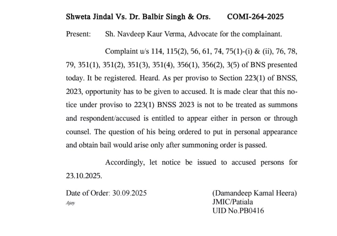ਸਿ਼ਕਾਇਤਕਰਤਾ ਸ਼ਵੇਤਾ ਜਿੰਦਲ ਵਲੋਂ ਅਦਾਲਤ ਵਿਚ ਦਿੱਤੀ ਗਈ ਸਿ਼ਕਾਇਤ ਵਿਚ ਜੋ ਧਾਰਾਵਾਂ ਲਗਾਈਆਂ ਗਈਆਂ ਹਨ ਵਿਚ 114, 115 (2), 56, 61, 74, 75 (1), (1), (11), 76, 78, 79, 351 (1), 351 (2), 351 (3), 351 (4), 356 (2) ਅਤੇ 3 (5) ਧਾਰਾਵਾਂ ਦਰਜ ਹਨ। ਅਦਾਲਤ ਨੇ ਕਿਹਾ ਹੈ ਕਿ ਇਸ ਸਿ਼ਕਾਇਤ ਨੂੰ ਰਜਿਸਟਰਡ ਕੀਤਾ ਜਾਵੇ ਅਤੇ ਸੁਣਵਾਈ ਪ੍ਰਕਿਰਿਆ ਪੂੂਰੀ ਕੀਤੀ ਜਾਵੇ ।