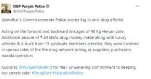 ਪੰਜਾਬ ਵਿੱਚ ਇਕ ਪਾਸੇ ਜਿੱਥੇ ਨਸ਼ਾ ਵੱਧਦਾ ਜਾ ਰਿਹਾ ਹੈ ਉੱਥੇ ਹੀ ਪੁਲਿਸ ਵਲੋਂ ਵੀ ਨਸ਼ੇ ‘ਤੇ ਨਕੇਲ ਕੱਸਣ ਦੀ ਪੂਰੀ ਕੋਸ਼ਿਸ਼ ਕੀਤੀ ਜਾ ਰਹੀ ਹੈ | ਇਸੇ ਦੇ ਤਹਿਤ ਨਸ਼ੇ ਖਿਲਾਫ ਜਲੰਧਰ ਪੁਲਿਸ ਨੂੰ ਮਿਲੀ ਵੱਡੀ ਕਾਮਯਾਬੀ ਮਿਲੀ ਹੈ | ਜਿਸਦੇ ਤਹਿਤ ਪੁਲਿਸ ਨੇ ਲਗਜ਼ਰੀ ਗੱਡੀਆਂ ਸਣੇ 84 ਲੱਖ ਦੀ ਡਰੱਗ ਮਨੀ ਬਰਾਮਦ ਕੀਤੀ ਹੈ | ਦਰਅਸਲ ,ਕੁਝ ਦਿਨ ਪਹਿਲਾਂ ਪੁਲਿਸ ਨੇ ਅੰਤਰਰਾਸ਼ਟਰੀ ਡਰੱਗ ਸਿੰਡੀਕੇਟ ਦਾ ਪਰਦਾਫ਼ਾਸ਼ ਕਰਦੇ ਹੋਏ 48 ਕਿਲੋਗ੍ਰਾਮ ਹੈਰੋਇਨ ਮਾਮਲੇ ਵਿਚ 13 ਮੈਂਬਰਾਂ ਨੂੰ ਗ੍ਰਿਫਤਾਰ ਕੀਤਾ ਗਿਆ ਸੀ ਅਤੇ ਇਸੇ ਮਾਮਲੇ ਦੀ ਅਗਲੀ ਕੜੀ ‘ਤੇ ਕਾਰਵਾਈ ਕਰਦੇ ਹੋਏ ਪੁਲਿਸ ਨੂੰ ਗ੍ਰਿਫਤਾਰ ਕੀਤੇ ਗਏ 13 ਮੈਂਬਰਾਂ ਤੋਂ ਲਗਜ਼ਰੀ ਗੱਡੀਆਂ ਤੇ ਇਕ ਟਰੱਕ ਦੇ ਨਾਲ 84 ਲੱਖ ਰੁਪਏ ਦੀ ਡਰੱਗ ਮਨੀ ਬਰਾਮਦ ਕੀਤੀ ਹੈ।