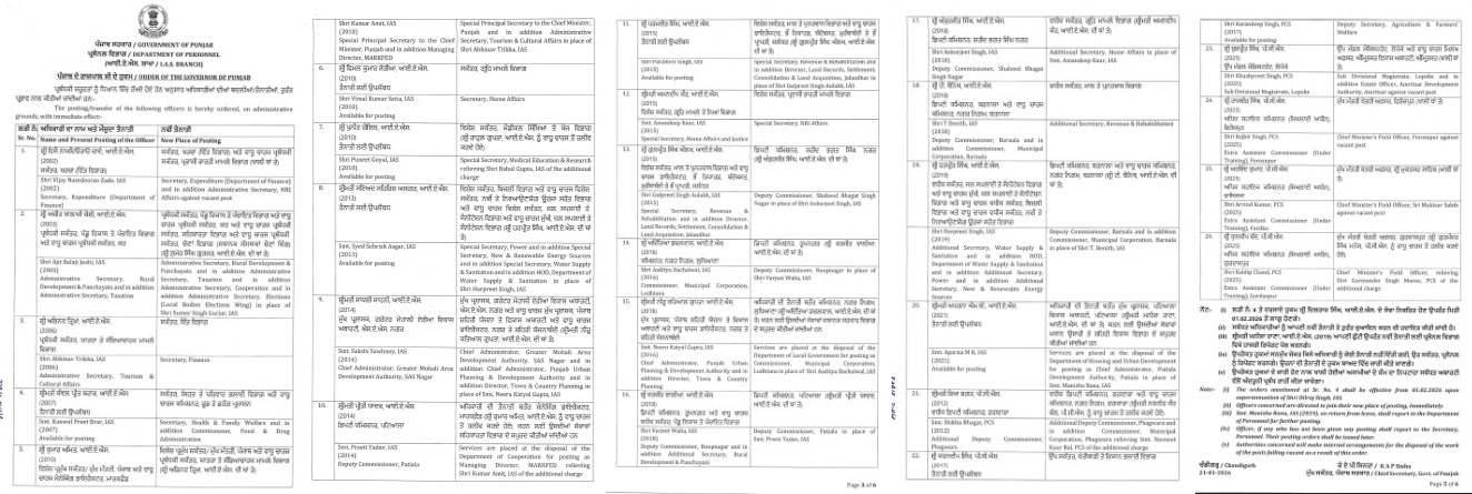 ਚੰਡੀਗੜ੍ਹ, 21 ਜਨਵਰੀ 2026 : ਪੰਜਾਬ ਸਰਕਾਰ (Punjab Government) ਦੇ ਚੀਫ ਸੈਕਟਰੀ ਕੇ. ਏ. ਪੀ. ਸਿਨਹਾ ਨੇ ਇਕ ਹੁਕਮ ਜਾਰੀ ਕਰਕੇ 26 ਆਈ. ਏ ਐਸ.,ਪੀ. ਸੀ. ਐਸ. ਅਧਿਕਾਰੀਆਂ ਦੇ ਤਬਾਦਲੇ (Transfers) ਕਰ ਦਿੱਤੇ ਹਨ, ਜਿਸ ਤਹਿਤ 4 ਜਿ਼ਲ੍ਹਿਆਂ ਦੇ ਡਿਪਟੀ ਕਮਿਸ਼ਨਰਾਂ ਨੂੰ ਵੀ ਇੱਧਰੋਂ-ਉੱਧਰ ਕੀਤਾ ਗਿਆ ਹੈ । ਹੁਕਮਾਂ ਮੁਤਾਬਕ ਪਟਿਆਲਾ, ਰੂਪਨਗਰ, ਸ਼ਹੀਦ ਭਗਤ ਸਿੰਘ ਨਗਰ ਅਤੇ ਬਰਨਾਲਾ ਦੇ ਡਿਪਟੀ ਕਮਿਸ਼ਨਰਾਂ ਦੀ ਬਦਲੀ ਵੀ ਹੋਈ ਹੈ। ਇਸ ਦੇ ਨਾਲ ਹੀ ਲੁਧਿਆਣਾ ਨਗਰ ਨਿਗਮ ਦੇ ਕਮਿਸ਼ਨਰ ਅਦਿੱਤਿਆ ਡੇਚਲਵਾਲ ਦੀ ਵੀ ਬਦਲੀ ਕਰ ਦਿੱਤੀ ਗਈ ਹੈ । ਜਿਨ੍ਹਾਂ ਦਾ ਵੇਰਵਾ ਇਸ ਤਰ੍ਹਾਂ ਹੈ :