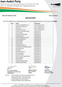 NewsPunjab ਪੰਜਾਬ ‘ਚ AAP ਨੇ Spokespersons ਦੀ ਲਿਸਟ ਕੀਤੀ ਜਾਰੀ || Punjab News By On Air 13 - August 24, 2024 0 134 FacebookTwitterPinterestWhatsApp ਪੰਜਾਬ ‘ਚ AAP ਨੇ Spokespersons ਦੀ ਲਿਸਟ ਕੀਤੀ ਜਾਰੀ ਆਮ ਆਦਮੀ ਪਾਰਟੀ ਪੰਜਾਬ ਵੱਲੋਂ ਹੇਠ ਲਿਖੇ ਬੁਲਾਰਿਆਂ ਦਾ ਐਲਾਨ ਕੀਤਾ ਗਿਆ ਹੈ।