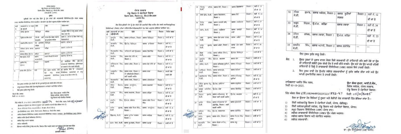 ਚੰਡੀਗੜ੍ਹ, 6 ਅਕਤੂਬਰ 2025 : ਪੰਜਾਬ ਸਰਕਾਰ (Punjab Government) ਦੇ ਵਿਸ਼ੇੇਸ਼ ਸਕੱਤਰ ਊਮਾ ਸ਼ੰਕਰ ਗੁਪਤਾ ਵਲੋਂ ਜਾਰੀ ਕੀਤੇ ਗਏ ਹੁਕਮਾਂ ਤਹਿਤ ਵੱਖ-ਵੱਖ ਬਲਾਕਾਂ ਅਤੇ ਉਪ-ਮੰਡਲ ਦਫ਼ਤਰਾਂ ਵਿਚ ਤਾਇਨਾਤ ਇੰਜੀਨੀਅਰਾਂ ਨੂੰ ਬਦਲਦਿਆਂ (Replacing engineers) ਕਈ ਕਰਮਚਾਰੀਆਂ ਦੀਆਂ ਨਿਯੁਕਤੀਆਂ ਸ਼ਾਮਲ ਹਨ ।