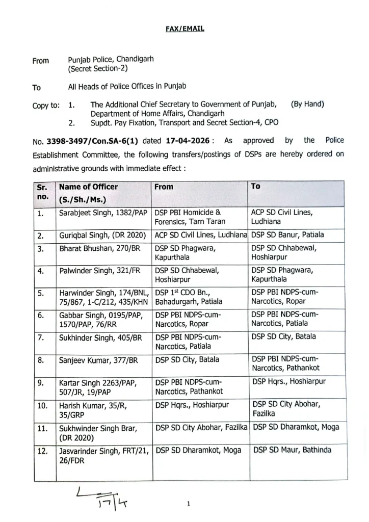 NewsBreaking NewsPunjabpunjab news ਪੰਜਾਬ ਸਰਕਾਰ ਨੇ ਕੀਤੇ ਪੁਲਸ ਅਧਿਕਾਰੀਆਂ ਦੇ ਵੱਡੇ ਪੱਧਰ ਤੇ ਤਬਾਦਲੇ By Rajesh Aggarwal - April 17, 2026 0 32 FacebookTwitterPinterestWhatsApp ਚੰਡੀਗੜ੍ਹ, 17 ਅਪ੍ਰੈਲ 2026 : ਪੰਜਾਬ ਸਰਕਾਰ (Punjab Government) ਨੇ ਪੁਲਸ ਪ੍ਰਸ਼ਾਸਨ ‘ਚ ਵੱਡਾ ਫੇਰਬਦਲ ਕਰਦੇ ਹੋਏ 129 ਡੀ. ਐੱਸ. ਪੀਜ. ਅਤੇ ਹੋਰ ਪੁਲਸ ਅਧਿਕਾਰੀਆਂ ਦੀਆਂ ਤਬਾਦਲੇ (Transfers) ਦੇ ਹੁਕਮ ਜਾਰੀ ਕੀਤੇ ਹਨ। ਜਿਨ੍ਹਾਂ ਵਿਚ :