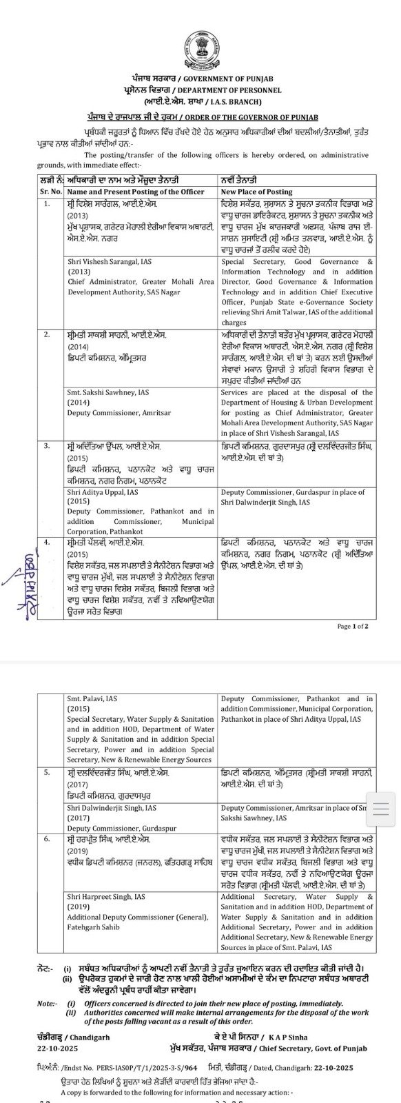ਦਲਵਿੰਦਰਜੀਤ ਸਿੰਘ ਡਿਪਟੀ ਕਮਿਸ਼ਨਰ ਗੁੁਰਦਾਸਪੁਰ ਨੂੰ ਬਦਲ ਕੇ ਡਿਪਟੀ ਕਮਿਸ਼ਨਰ ਅੰਮ੍ਰਿਤਸਰ ਅਤੇ ਹਰਪ੍ਰੀਤ ਸਿੰਘ ਵਧੀਕ ਡਿਪਟੀ ਕਮਿਸ਼ਨਰ (ਜਨਰਲ) ਫਤਿਹਗੜ੍ਹ ਸਾਹਿਬ ਨੂੰ ਬਦਲ ਕੇ ਵਧੀਕ ਸਕੱਤਰ, ਜਲ ਸਪਲਾਈ ਤੇ ਸੈਨੀਟੇਸ਼ਨ ਵਿਭਾਗ ਅਤੇ ਵਾਧੂ ਚਾਰਜ ਮੁਖੀ, ਜਲ ਸਪਲਾਈ ਤੇ ਸੈਨੀਟੇਸ਼ਨ ਵਿਭਾਗ ਅਤੇ ਵਾਧੂ ਚਾਰਜ ਵਧੀਕ ਸਕੱਤਰ, ਬਿਜਲੀ ਵਿਭਾਗ ਅਤੇ ਵਾਧੂ ਚਾਰਜ ਵਧੀਕ ਸਕੱਤਰ, ਨਵੀਂ ਤੇ ਨਵਿਆਉਣਯੋਗ ਊਰਜ਼ਾ ਸਰੋਤ ਵਿਭਾਗ (ਸ਼੍ਰੀਮਤੀ ਪੱਲਵੀ ਆਈ. ਏ. ਐਸ. ਦੀ ਥਾਂ ਤੇ) ਬਦਲਿਆ ਗਿਆ ਹੈ ।