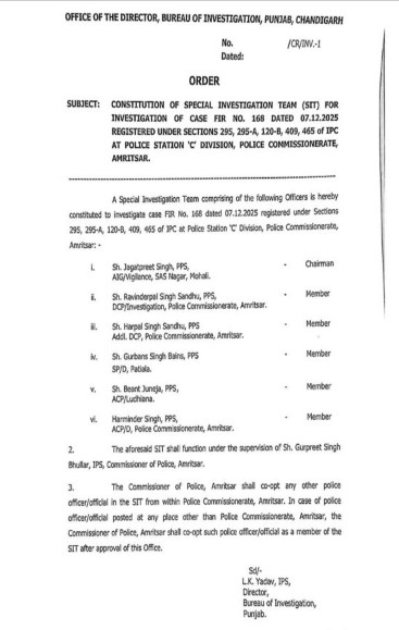 ਚੰਡੀਗੜ੍ਹ, 22 ਦਸੰਬਰ 2025 : ਆਮ ਆਦਮੀ ਪਾਰਟੀ ਦੀ ਅਗਵਾਈ ਵਾਲੀ ਪੰਜਾਬ ਸਰਕਾਰ (Punjab Government) ਨੇ ਸ੍ਰੀ ਗੁਰੂ ਗ੍ਰੰਥ ਸਾਹਿਬ (Sri Guru Granth Sahib) ਦੇ 328 ਪਾਵਨ ਸਰੂਪਾਂ (Holy forms) ਦੇ ਮਾਮਲੇ ਵਿਚ ਅਹਿਮ ਕਦਮ ਚੁੱਕਦਿਆਂ ਇਸ ਮਾਮਲੇ ਦੀ ਜਾਂਚ ਲਈ 6 ਮੈਂਬਰਾਂ ਤੇ ਆਧਾਰਤ ਸਿਟ ਦਾ ਗਠਨ (Formation of the SIT) ਕਰ ਦਿੱਤਾ ਹੈ, ਜਿਸ ਦੀ ਅਗਵਾਈ ਏ. ਆਈ. ਜੀ. ਵਿਜੀਲੈਂਸ ਮੁਹਾਲੀ ਜਗਤਪ੍ਰੀਤ ਸਿੰਘ ਅਤੇ ਨਿਗਰਾਨੀ ਅੰਮ੍ਰਿਤਸਰ ਪੁਲਸ ਕਮਿਸ਼ਨਰ ਗੁਰਪ੍ਰੀਤ ਸਿੰਘ ਭੁੱਲਰ ਕਰਨਗੇ ।