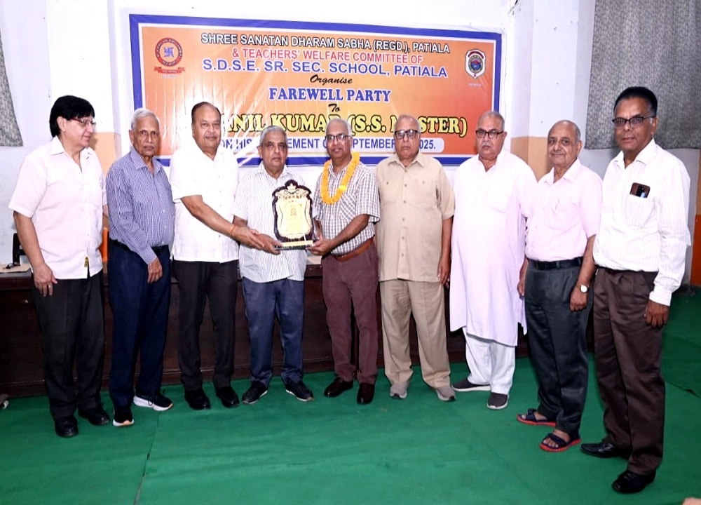 ਪਟਿਆਲਾ, 2 ਅਕਤੂਬਰ 2025 : ਸ਼੍ਰੀ ਸਨਾਤਨ ਧਰਮ ਸਭਾ ਪਟਿਆਲਾ (Shri Sanatan Dharam Sabha Patiala) ਦੇ ਪ੍ਰਧਾਨ ਲਾਲ ਚੰਦ ਜਿੰਦਲ ਦੀ ਯੋਗ ਅਗਵਾਈ ਹੇਠ 25 ਸਾਲ ਇਸ ਇਤਿਹਾਸਕ ਸਕੂਲ ਦੀ ਸੇਵਾ ਕਰਨ ਤੋਂ ਬਾਅਦ ਸੇਵਾਮੁਕਤੀ ‘ਤੇ ਐਸ. ਡੀ. ਐਸ. ਈ. ਸੀਨੀਅਰ ਸੈਕੰਡਰੀ ਸਕੂਲ, ਪਟਿਆਲਾ ਵਿਖੇ ਐਸ. ਐਸ. ਐਸ. ਮਾਸਟਰ ਅਨਿਲ ਕੁਮਾਰ ਭਾਰਤੀ (S. S. S. Master Anil Kumar Bharti) ਨੂੰ ਰਸਮੀ ਤੌਰ ‘ਤੇ ਸਨਮਾਨਿਤ ਕੀਤਾ ਗਿਆ ।
